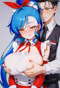 half crows-Eyes。Dark blue colored hair 。 ponytail。Waitress clothes。Yellow Eyes。Big Breasts。 troubled face。 I’m in trouble。Grab the 。 get your butt rubbed。You can put your hands inside clothes。The location is a gorgeous cafe。Close Contact。 exhale a passionate sigh。Pretty blushing。Bulge