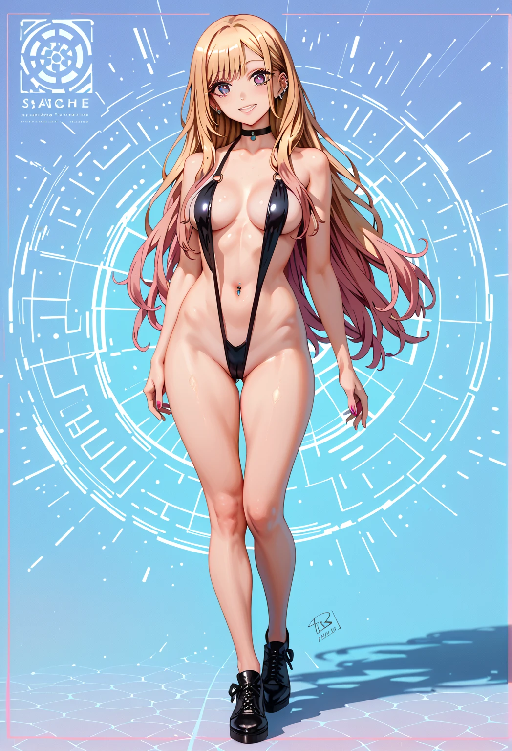 ((full body shot)), hight resolution, absurdres, best_Quality, Ultra_Detailled, 8K, extremely_clear, photo, beautiful, Beautiful face, Scharp Focus, HDR, JK, 1girl, Clean eyes, very wide-eyed, pink eyes, cyberpunk megacity background , hanabi, Beautiful face, standing , very seductive pose, very young, , no bra, bare chest, No Top, NSFW, Blonde long hair, multicolored hair, pierced ears, KJOmarin, large tits, black slingshot swimsuit,
