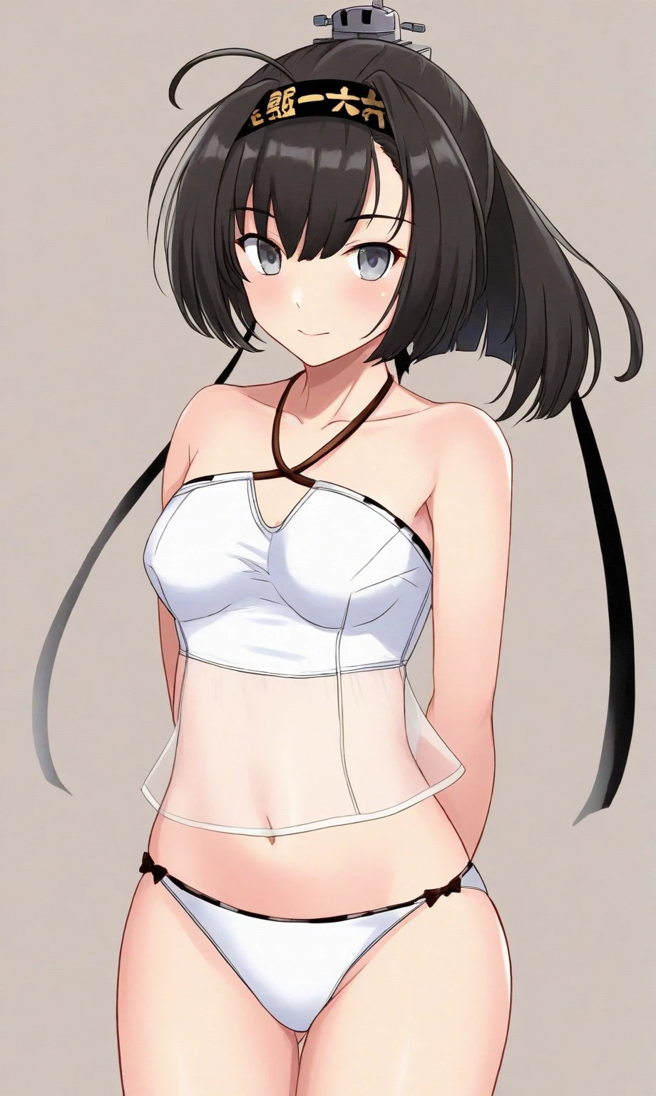 AI Erotic PicturesakizukisummerKC, grey eyes,black hair, long hair,navel, collarbone, swimsuit, ponytail, ahoge, bikini, headband, white bikini, clothes writing, hachimaki, black headband, see-through
