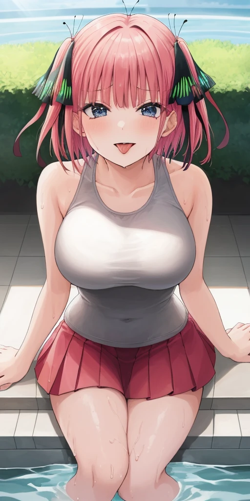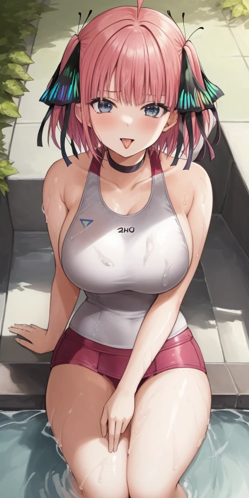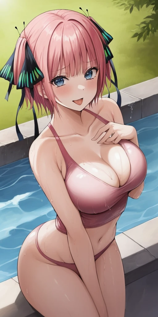 High resolution, Nakano Nino,1 Girl,Pink Hair,Short Hair,Butterfly Hair Ornament, from above, pool, sunlight, curvy, aroused, long tongue, large breasts